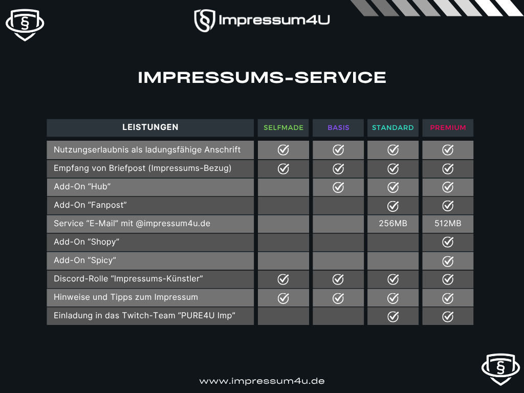 Hier findest du alle Leistungen rund um deinen Impressum-Service übersichtlich dargestellt.